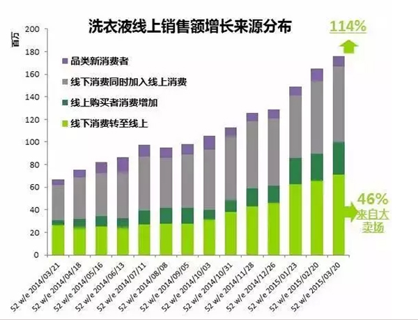 與此同時,線上銷售額增長中有41%直接轉(zhuǎn)換自線下的銷售,而這其中又有近一半直接搶奪自傳統(tǒng)大賣場,洗衣液的線上消費對線下購買,特別是對傳統(tǒng)KA大賣場的沖擊之大可見一斑。